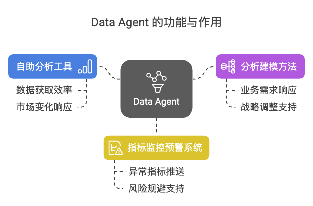 同时,Data Agent 精通多种自助分析工具及分析建模方法,能够显著提升业务人员的数据获取效率,使其能够迅速响应市场变化与业务需求。Data Agent 还主导指标监控预警系统的搭建,在关键指标出现异常时,主动向业务人员推送深入的分析结果与针对性建议,为企业在复杂多变的市场环境中及时调整战略、规避风险提供有力支持。