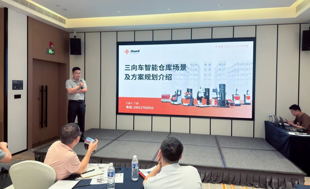 会议过半,卓一智能叉车AGV事业部营销经理带来三向车智能仓库场景以及方案规划介绍。在剖析了当前自动化仓库市场的技术方案后,他精准阐述了卓一窄巷道三向AGV叉车的差异化场景定位。随后,通过库容率提升、综合成本优化、施工周期缩短等核心维度,系统化解读了卓一三向AGV叉车的竞争优势,并结合实际案例展示了卓一在数字化物流领域的成熟落地能力,为现场嘉宾提供了极具参考价值的方案规划流程。