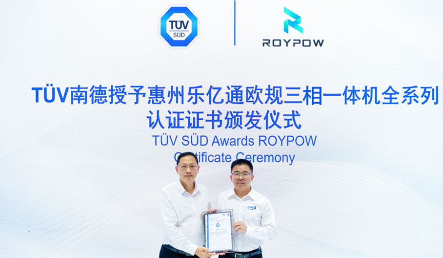 TÜV南德欧阳强友(右)授予乐亿通欧规三相一体机全系列产品认证证书