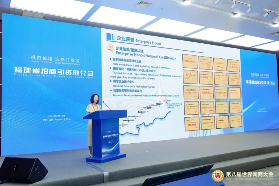 2025年6月18日,以“汇聚闽商力量,同心奋勇争先”为主题的第八届世界闽商大会在福州隆重举行,我司董事长杨静以福建省招商顾问身份受邀参加本次世界闽商大会,并分享了公司的发展蓝图。