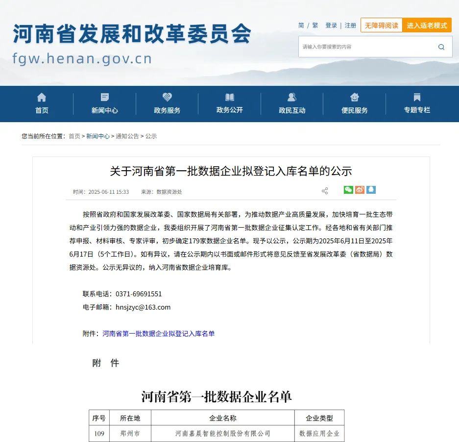 近日,河南省发改委、工信厅相继公布河南省第一批数据企业名单和2025年河南省人工智能创新平台、创新企业、创新产品和创新应用名单,嘉晨智能凭借在数据技术应用与人工智能创新方面的卓越表现,成功入选河南省第一批数据企业名单和2025年河南省人工智能创新企业。