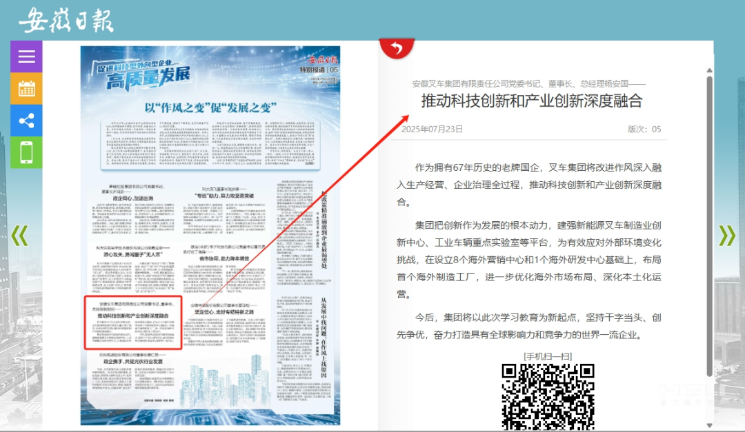 在此次备受瞩目的大会上,奇瑞控股、科大讯飞等 8 家行业领军企业及合肥市、芜湖市代表纷纷登台,分享各自的宝贵经验,共同描绘未来发展蓝图。安徽叉车集团党委书记、董事长、总经理杨安国作为国企代表,其发言更是引发了媒体的广泛关注。