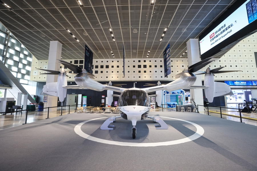 由上海时的科技有限公司自主研发的E20 eVTOL是代号为“E20”的倾转旋翼国产5座载人电动飞机亮相展览现场。