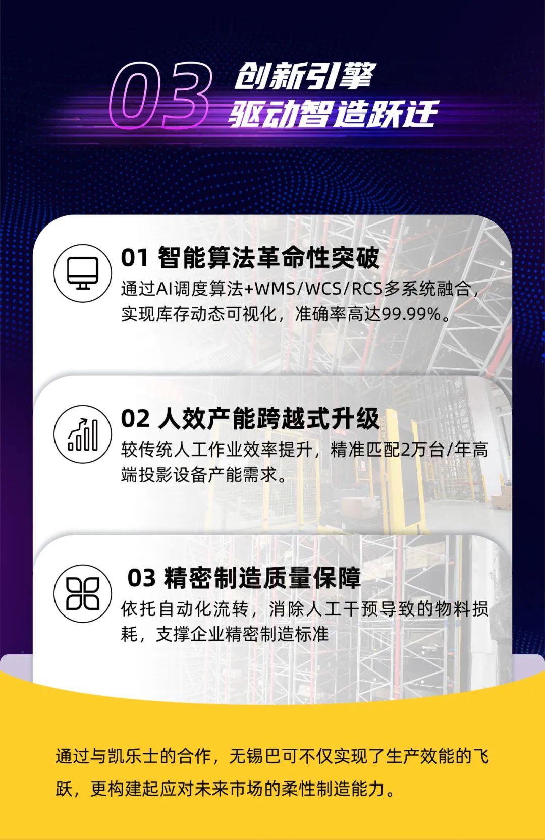 作为智能物流机器人专家,凯乐士科技提供业内领先的模块化、可扩展的综合智能物流解决方案,赋能企业供应链运营模式的转型,令运营效率再创新高。