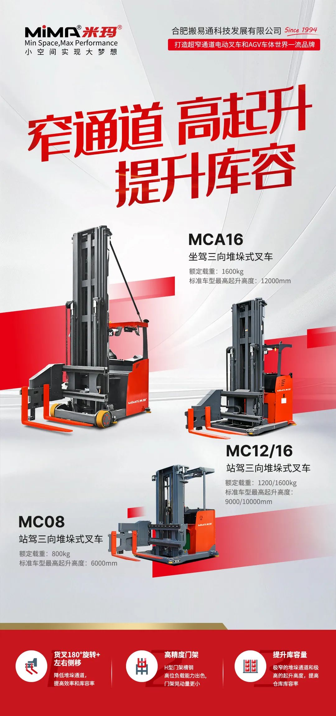 在仓储物流的较量里,效率提上来、成本降下去、安全守得住,就是企业甩开对手的底气。合肥搬易通(MiMA米玛)人下型三向堆垛式叉车(站驾MC系列、坐驾MCA系列),早已是各行业盘活仓储的硬帮手。对客户而言,选它,就是让仓库跑得更顺、花得更省、风险更低——每一次精准堆垛,都是在为业务攒实力。