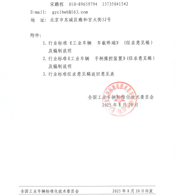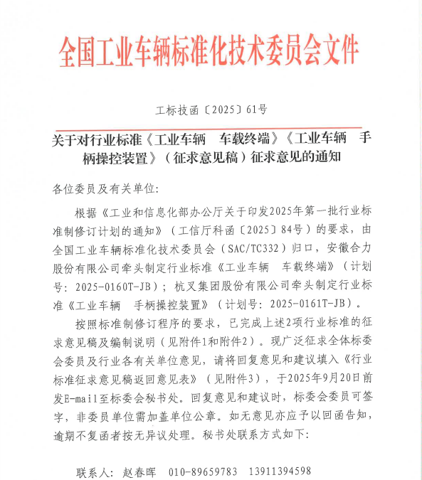 关于对行业标准《工业车辆 车载终端》《工业车辆 手柄操控装置》(征求意见稿)征求意见的通知