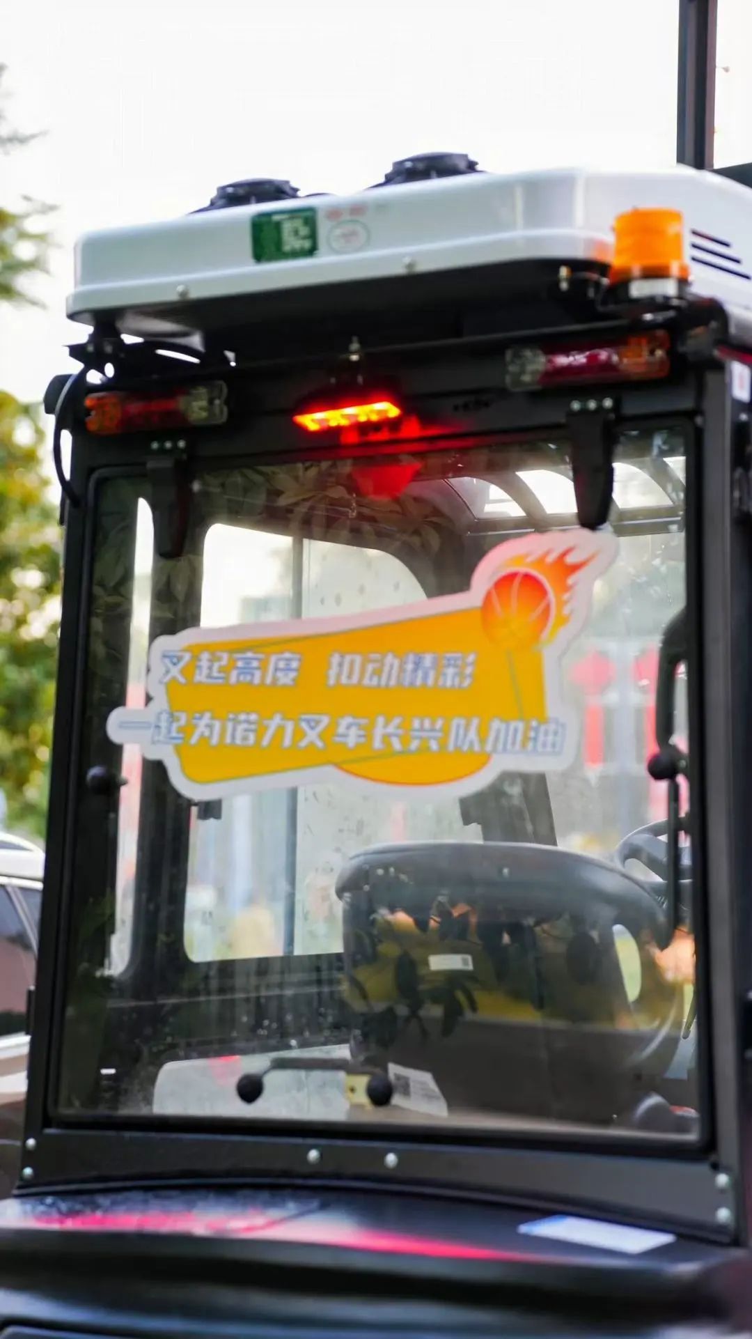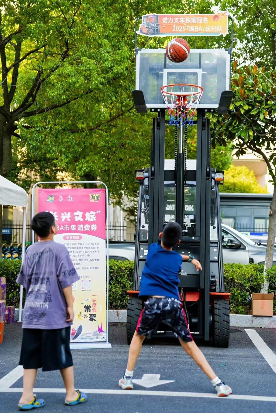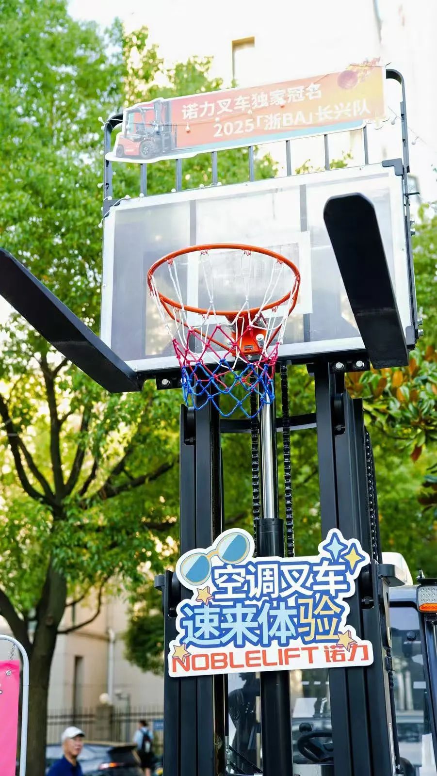 室内观众席上,诺力成员组成助威团,手持专属加油手幅,用整齐划一的口号成为球队最强后援。室外广场则化身球迷乐园:公司特别在馆外区域布置了两台配备空调的叉车,为前来观赛的市民提供清凉舒适的休息空间,成为现场别具一格的互动打卡点。同时,还搭建了以叉车门架为结构的篮球框,吸引大量球迷踊跃尝试投篮,感受篮球乐趣。现场用于投篮互动的篮球别具意义——带有长兴队全部球员的亲笔签名。