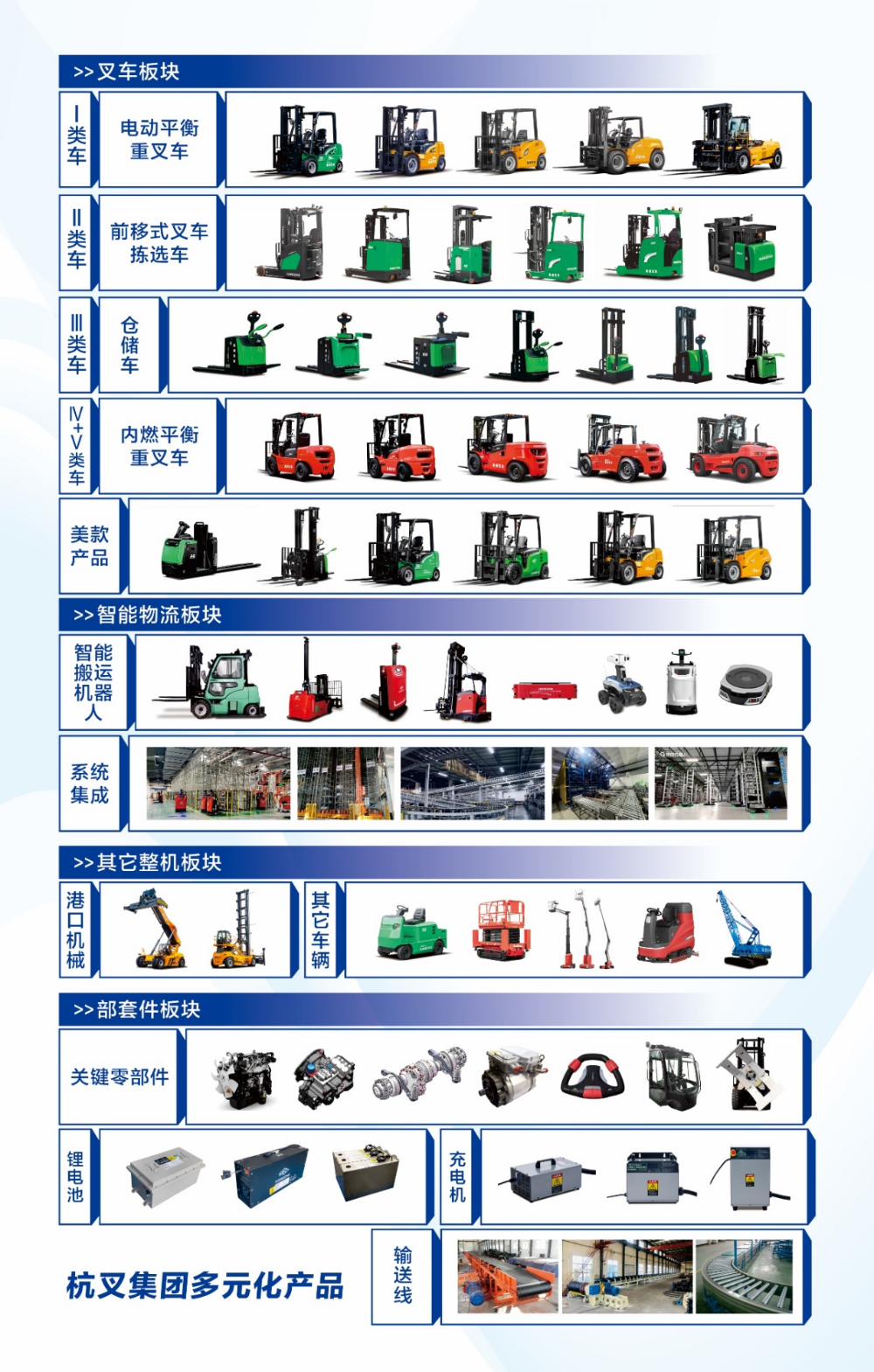 公司已形成1-48吨内燃叉车、0.75-18吨蓄电池叉车、集装箱专用叉车、45吨集装箱正面吊、牵引车、搬运车、堆高车、越野叉车、伸缩臂叉车、登高车等全系列、多品种的产品结构以及多款AGV智能工业车辆,达上万种品种规格。自主开发的新产品多次荣获全国机械工业大奖,省、市科技进步奖,并获全国用户满意产品称号,主导产品获国家出口免验资格。