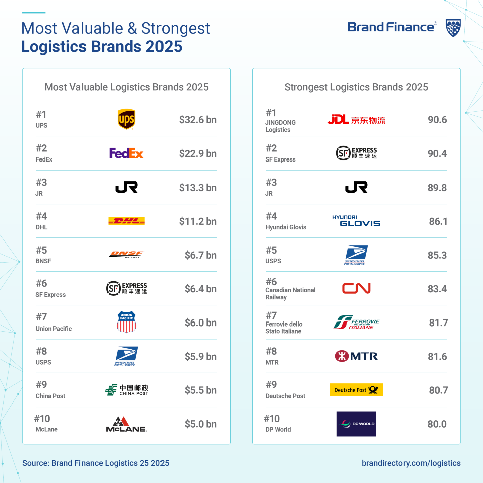 京东物流(品牌价值增长 15% 至 41 亿美元)凭借 90.5/100 的品牌强度指数 (BSI) 和 AAA+ 的品牌强度评级,成为 2025 年榜单上最强的物流品牌。其崛起得益于全球扩张、高端定位以及在 ESG 和可持续交付实践方面的行业领导地位。