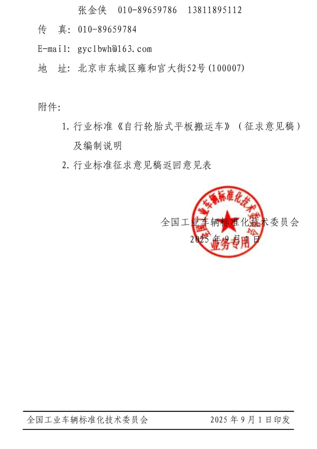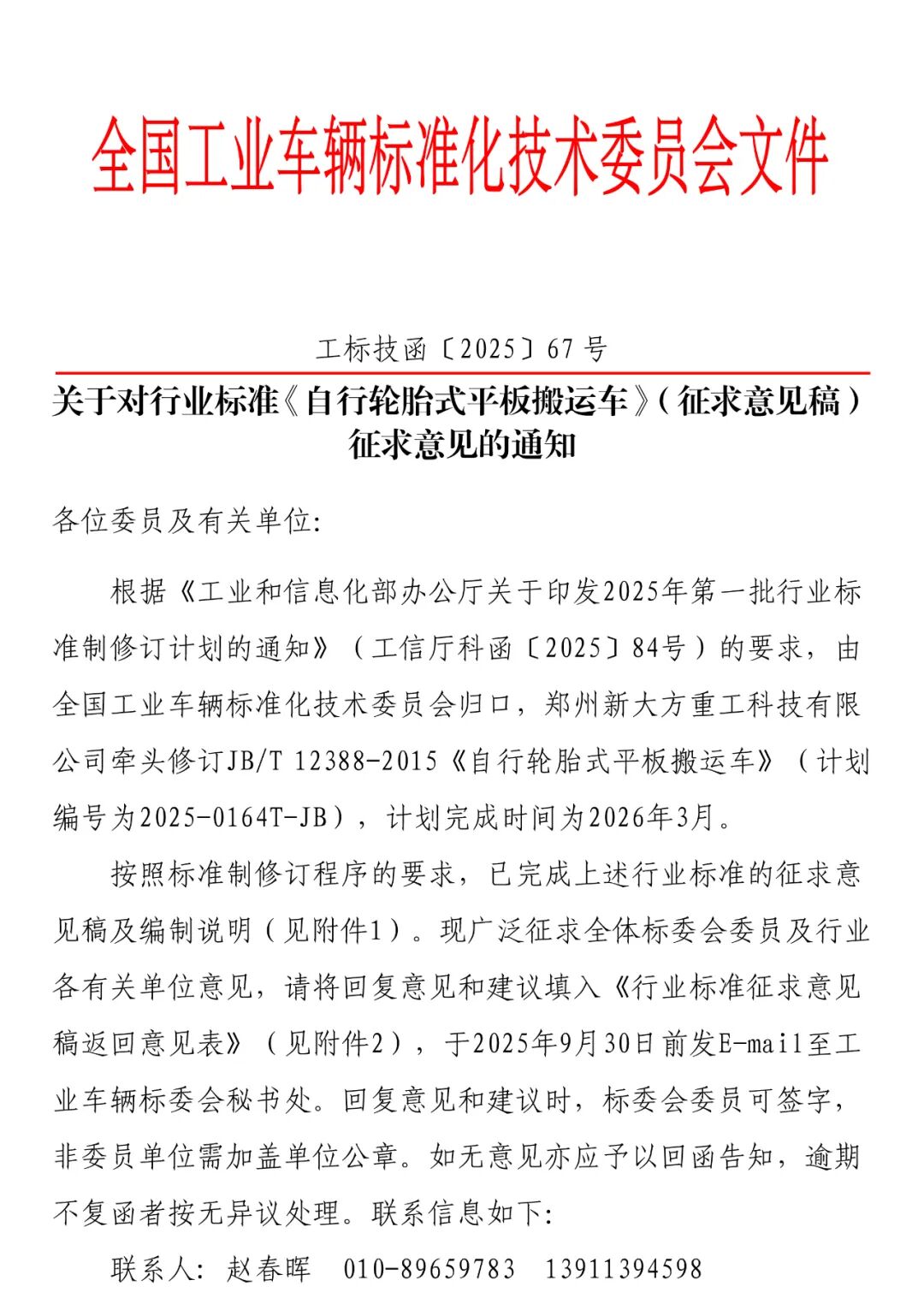 关于对行业标准《自行轮胎式平板搬运车》(征求意见稿)征求意见的通知