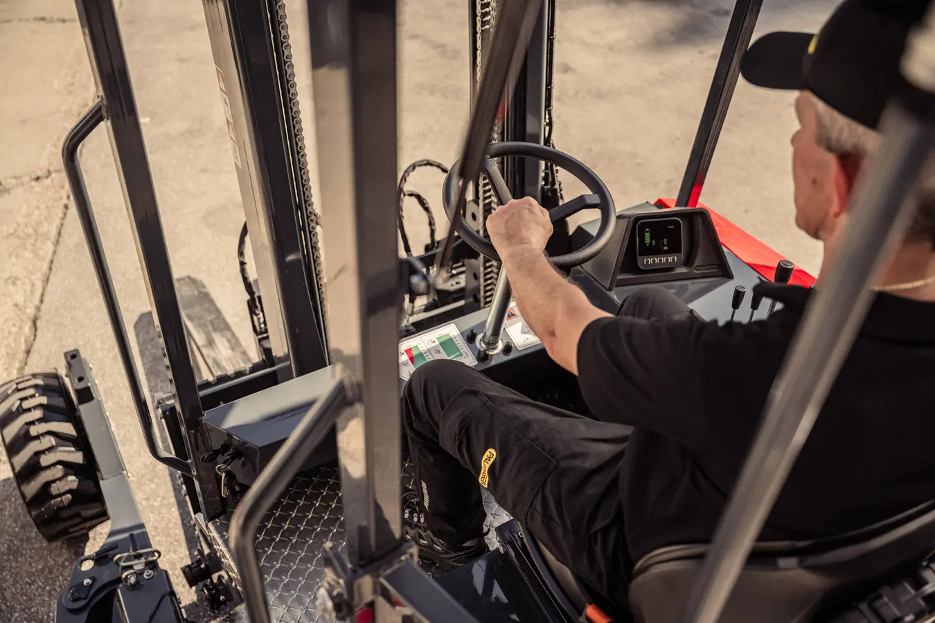 从产品看,FLM 25 的“中置且抬升”座椅带来更好的视野与稳定感:座高约 1.44 米,可实现近 360°环视;门架外置液压管路进一步改善了视线穿透,宽檐顶部与更大的脚舱空间提升全天候防护与驾乘舒适。关键性能方面,FLM 25 额定起重量达 2,500 kg,整机自重控制在 2 吨以内,形成同级优秀的载荷-自重比;180° 转向与四向行驶模式显著提升狭窄空间掉头与长料搬运能力;伸缩货叉支持“第二排”取放货;同时配备地面控制,便于驾驶员在上下车或装卸到卡车上时安全高效地完成操作。