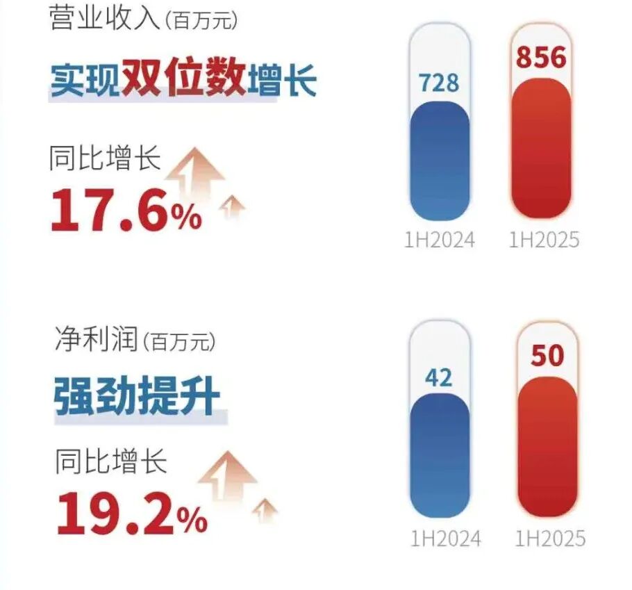2025年8月22日,佛朗斯股份(2499.HK)披露中期业绩报告。报告显示,公司上半年实现营业收入8.56亿元,同比增长17.6%;净利润0.5亿元,同比增长19.2%,收入和利润均创历史新高。同时,通过平衡规模扩张与效益提升,实现国内与国际业务协同,这将进一步推动公司的快速发展。
