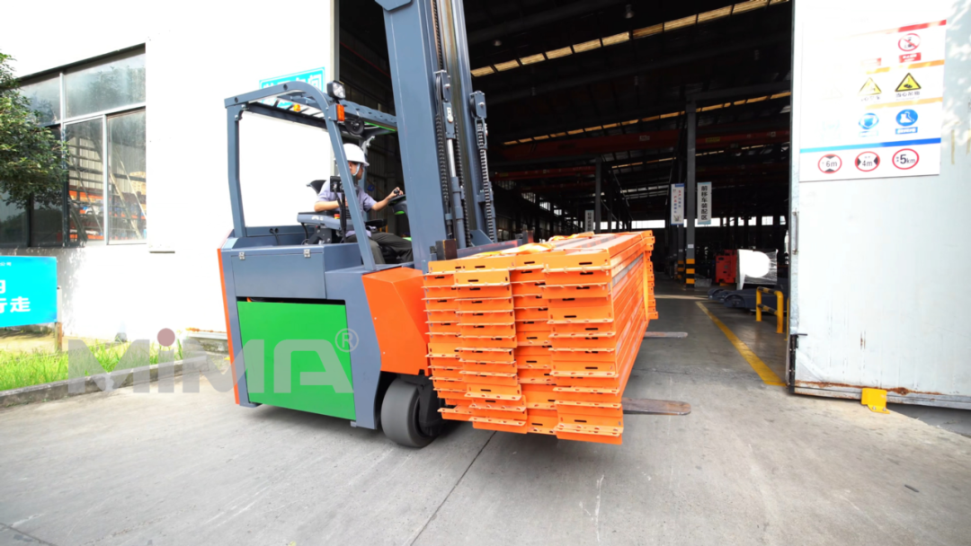 MQK40采用三支点三驱设计和三轮转向独立控制系统,完美实现直行、侧行、斜行和原地回转等全向行驶模式,长物料侧行堆垛通道较小,最小堆垛通道3.5m,最大起升高度7.5m,搬运长物料效率更高。