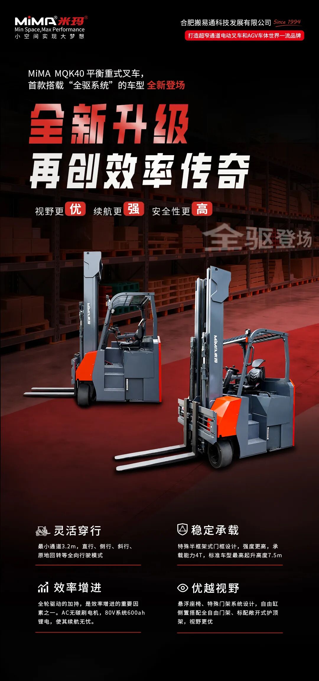 在物流行业飞速发展的今天,合肥搬易通(MiMA)始终秉承"打造超窄通道电动叉车和AGV车体世界一流品牌"的愿景,推出全新MQK40全向平衡重叉车。这款集多项创新技术于一身的4吨级全向平衡重叉车,将为您带来前所未有的物料搬运体验。