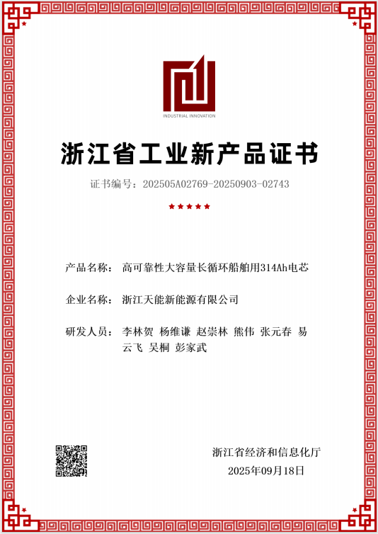新能源动力船舶长期面临续航焦虑、充电繁琐与维护成本高等痛点。近日,天能研发的314Ah大容量电芯,通过中国船级社CCS认证,荣膺“浙江省工业新产品”。