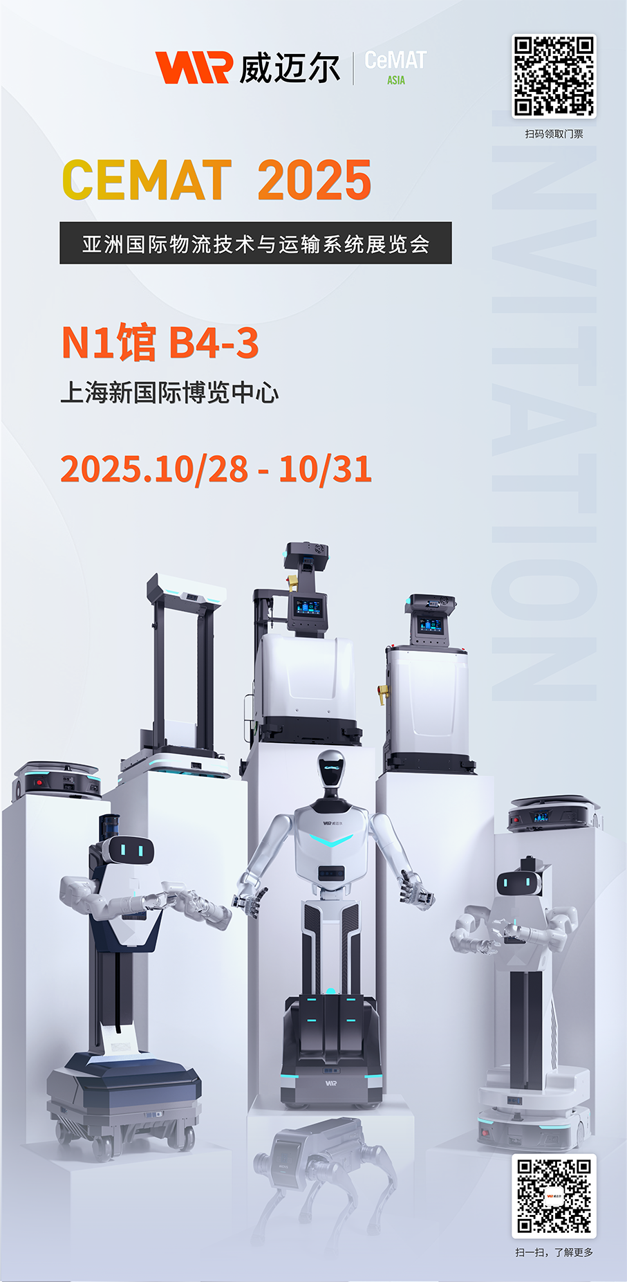 亚洲国际物流技术与运输系统展览会(CeMAT ASIA 2025)即将在上海揭幕。智能机器人领军企业威迈尔宣布将携四大创新产品重磅亮相,包括高灵活性人形机器人、自主导航四足机器人、全新升级的潜伏搬运机器人和智能无人叉车。威迈尔将首次把“人-机-狗协同”的全新工业场景应用搬进展会现场,为物流行业智能化变革开启全新篇章。诚邀合作伙伴莅临威迈尔展台参观、交流!