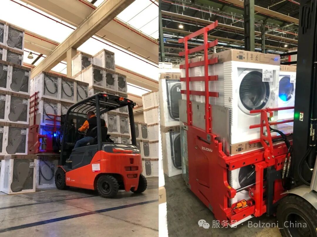 博索尼(BOLZONI) 集团将纸箱夹的标准技术特性,与液压、电子及激光传感器的尖端技术融合,实现夹持力精准调控,为家电制造商入库仓库及第三方物流(3PL)的物流提供先进的解决方案。