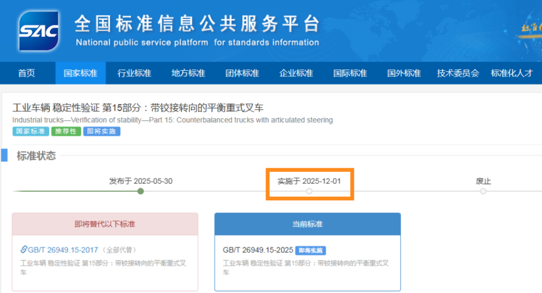 根据全国标准信息公共服务平台显示,由卓一智能叉车作为参加起草单位之一的国家标准《工业车辆稳定性验证第15部分:带铰接转向的平衡重式叉车》已于2025年5月30正式发布,并将于 2025年12月1日实施。卓一智能叉车总经理潘小军先生作为标准主要起草人,参与了该项国家标准的修订工作。