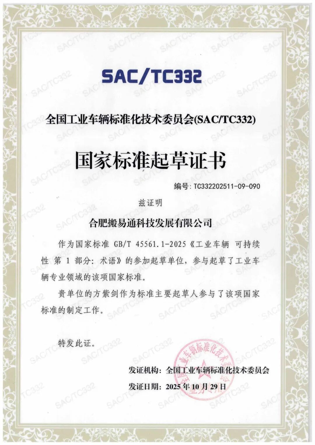 近日,合肥搬易通科技发展有限公司(MiMA)作为国家级专精特新“小巨人”企业,凭借其在工业车辆领域的技术积累,深度参与了国家标准起草工作,收到由全国工业车辆标准化技术委员会颁发的四项国家标准起草证书,为推动行业标准化、规范化和安全发展贡献了重要力量。