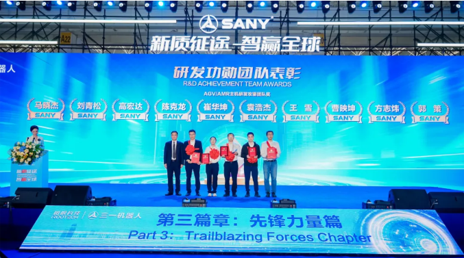 VCU2.0研发团队(成员汪剑奇、孙永前);汽车级高压锂电电池团队(成员杨振忠、吴平、贾志强)获“部件研发攻坚团队奖”;SCP30C6主机研发攻坚奖(成员:刘勇、陈余、汪剑奇、曹保卫、武阳阳、李凡亭、乔任泽)、AGV/AMR无人产品研发攻坚团队(成员:陈克龙、王雪、曹映坤、方志炜、郭策)获“主机研发攻坚团队奖”,三一机器人公司常务副总经理,叉车项目总经理冯振礼为获奖团队颁奖。