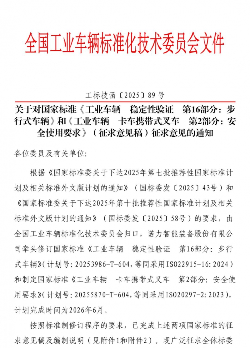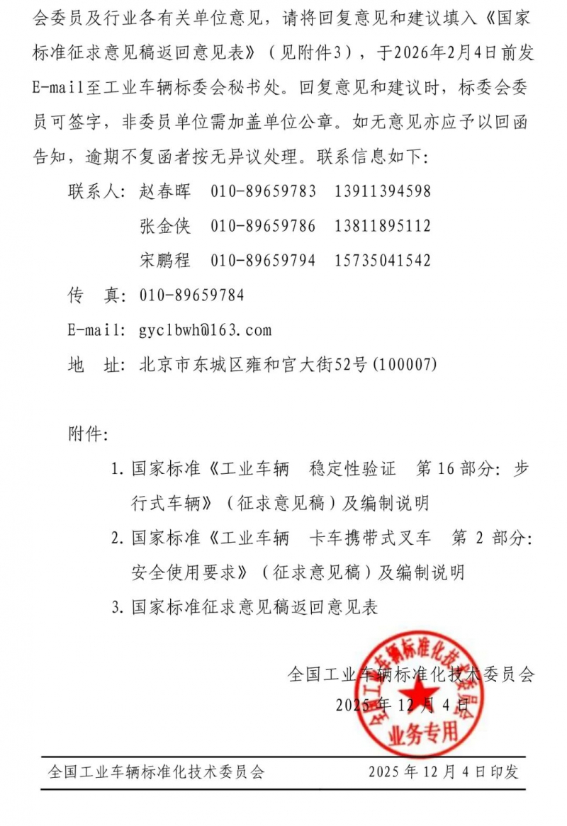 关于对《工业车辆 稳定性验证 第16部分:步行式车辆》等两项国家标准(征求意见稿)征求意见的通知
