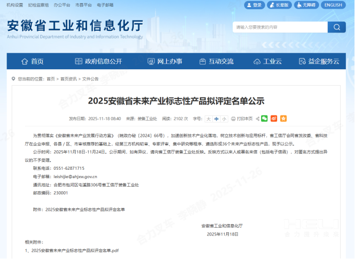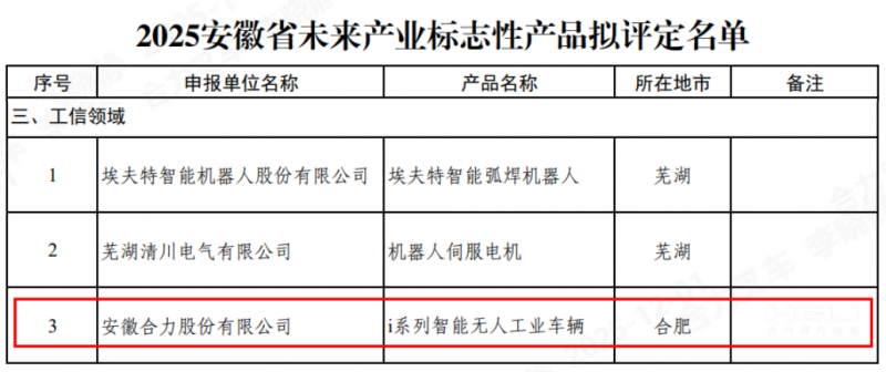 近期,安徽省工信厅对2025年安徽省未来产业标志性产品拟评定名单进行了公示,安徽合力股份有限公司(以下简称“合力”)申报的产品“i系列智能无人工业车辆”成功入选。