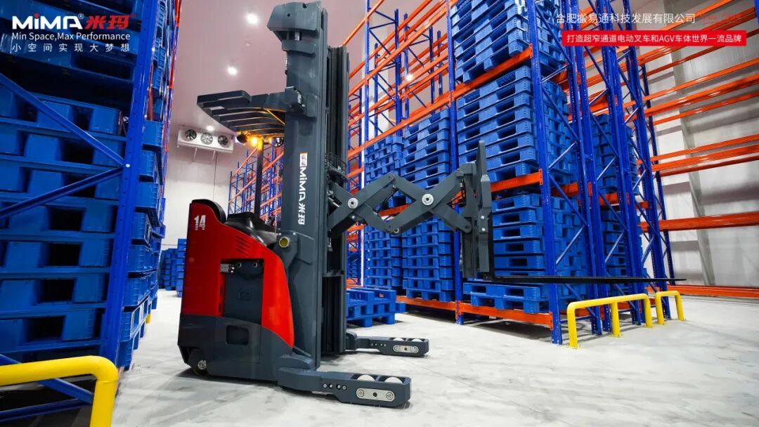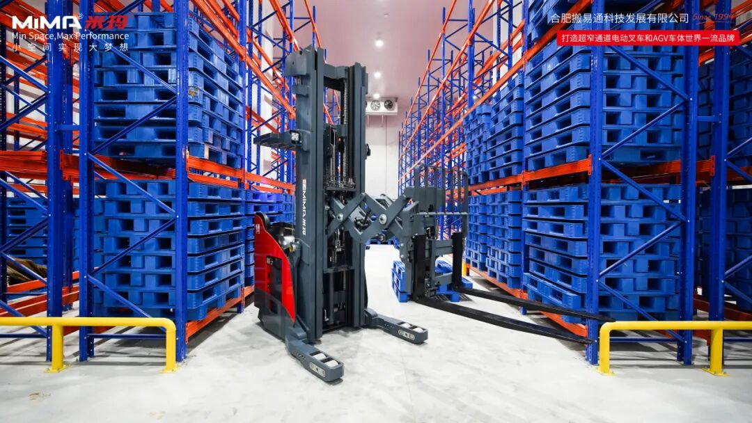 面对-18°C左右的极端低温与复杂仓储场景,合肥搬易通(MiMA)依托卓越技术实力, 全方位破解冷库仓储痛点,助力企业实现仓储扩容升级与降本增效双重目标。MiMA专业销售工程师为其制定了超窄通道物料搬运解决方案,推荐使用站驾双深位前移式叉车MFE14。