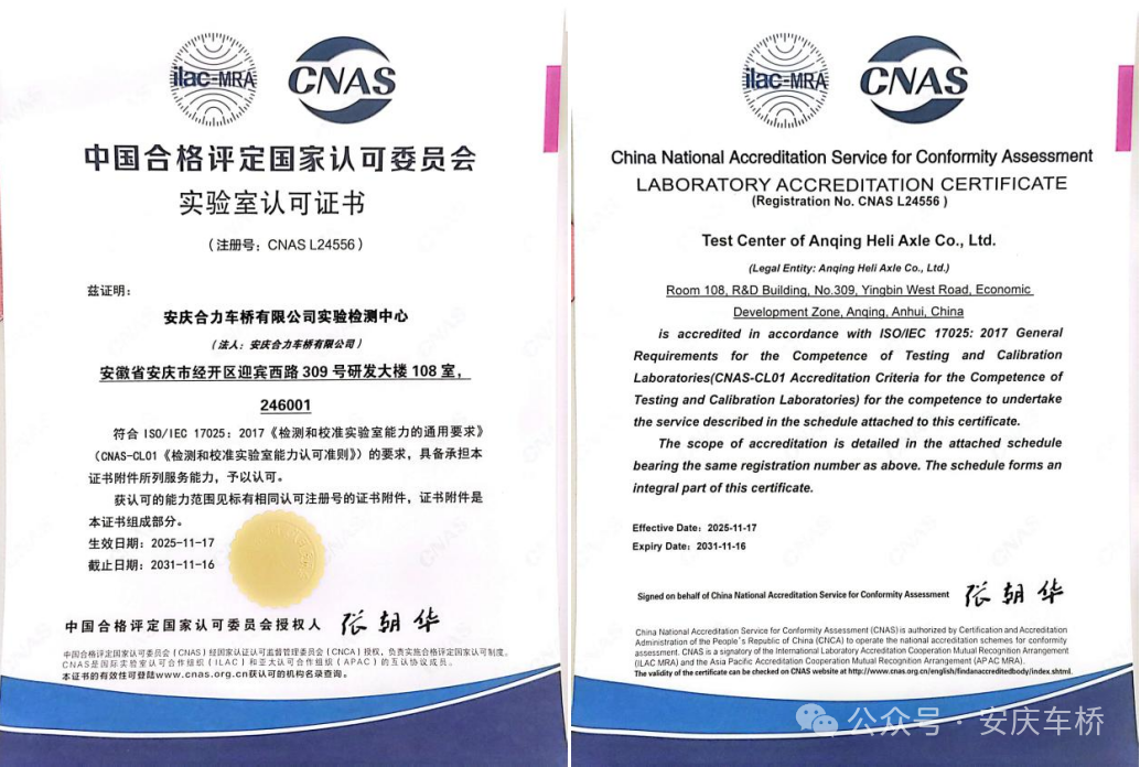 近日,安庆车桥实验检测中心取得重要突破——首次正式通过中国合格评定国家认可委员会(CNAS)认可,认可注册号为:CNASL24556。