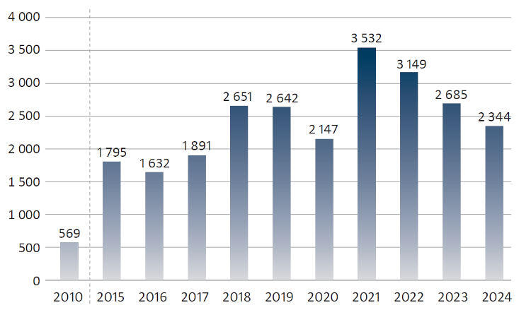 根据国际机器人联合会(IFR)发布的《2025年世界机器人报告》,2024年波兰共安装了2344台新机器人,比上一年下降了13%。这也是波兰工业机器人安装量连续第三年下降,此前在2021年曾创下历史新高,当年波兰安装了3532台工业机器人。