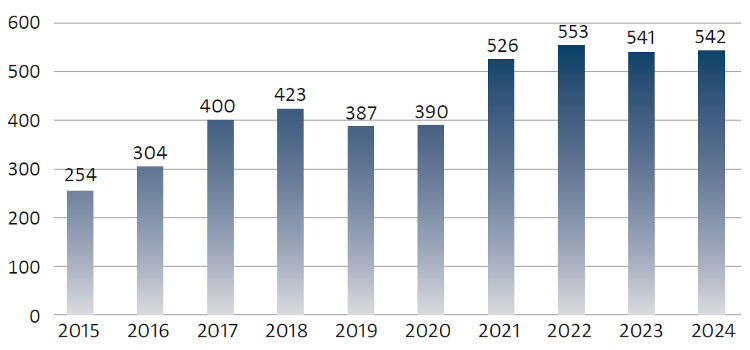 全球市场保持稳定,2024年新增机器人数量为54.2万台,略高于上年。中国依然稳居市场领先地位,去年新增机器人数量达29.5万台,占全球新增总量的54%以上。日本位居第二,2024年新增机器人数量为4.45万台。