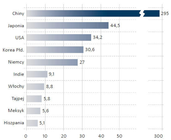 相比之下,全球平均水平目前为每1万名工人拥有177台机器人,这意味着波兰的表现比全球平均水平差了两倍多。在亚洲,这一数字达到204台,欧洲为148台,美洲为131台。当我们观察全球机器人化领先国家时,差距更加显著。在韩国,每1万名工人就拥有超过1000台机器人——是波兰的12倍之多。新加坡的机器人数量即将达到800台,而中国、德国和日本到2023年都将超过400台。