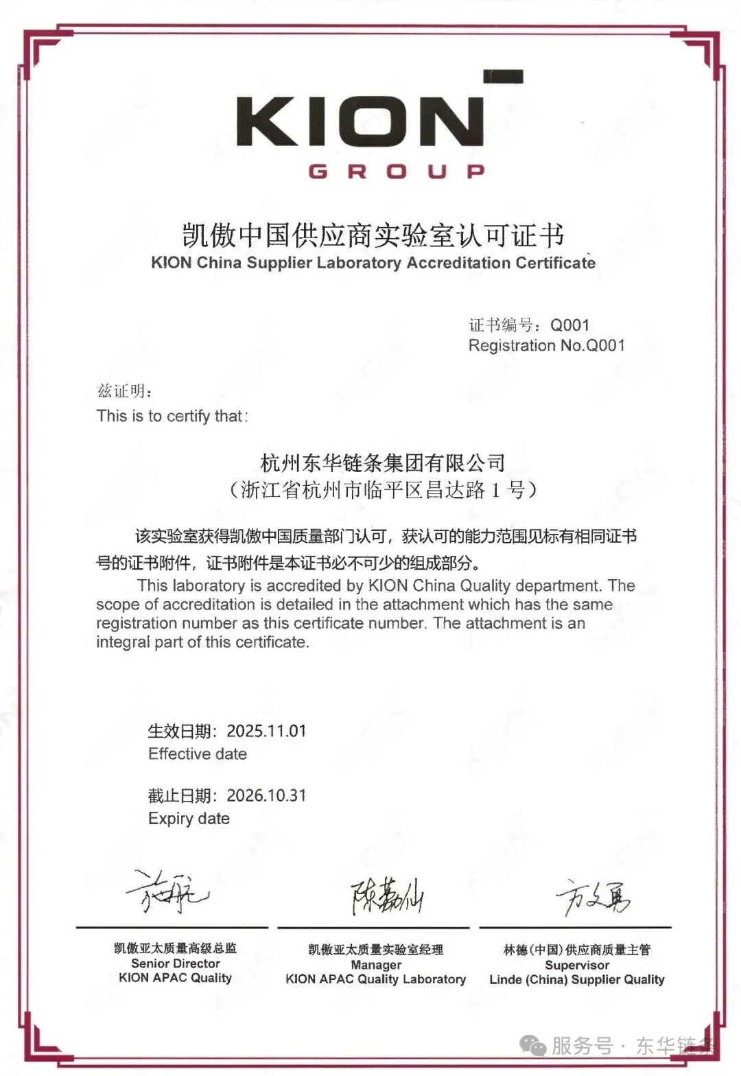 日前,东华链条获凯傲中国供应商实验室认可证书(编号:Q001),成为凯傲集团本年度首家通过该认可的供应商。
