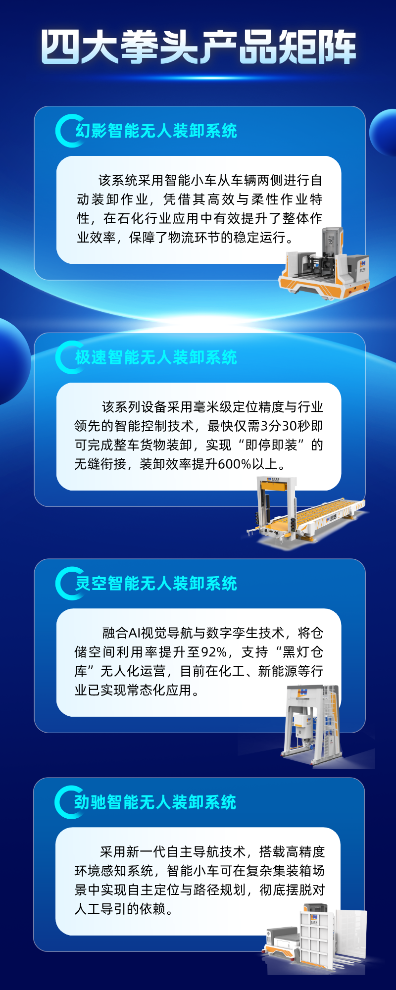 - 作为公司首款自主研发的智能无人装车装备,适配集装箱、方舱及后开式货箱,引领无托盘垛装物料发货进入智能新时代。技术实力行业领先,开创国内该领域智能化先河。