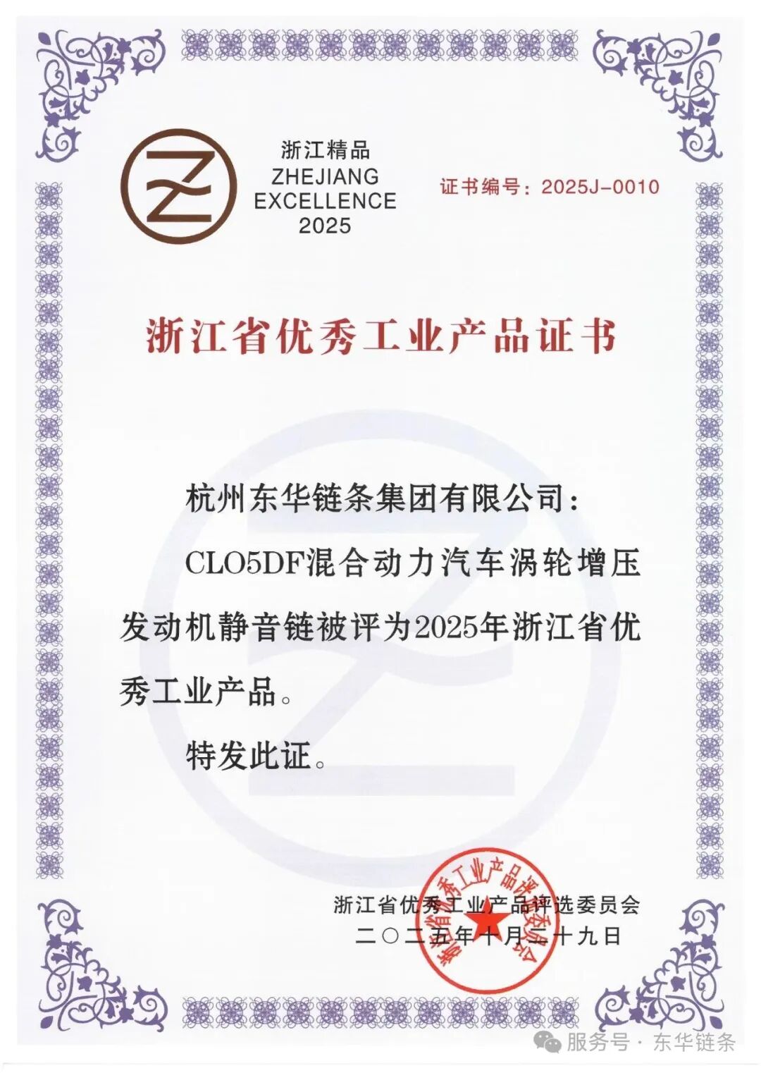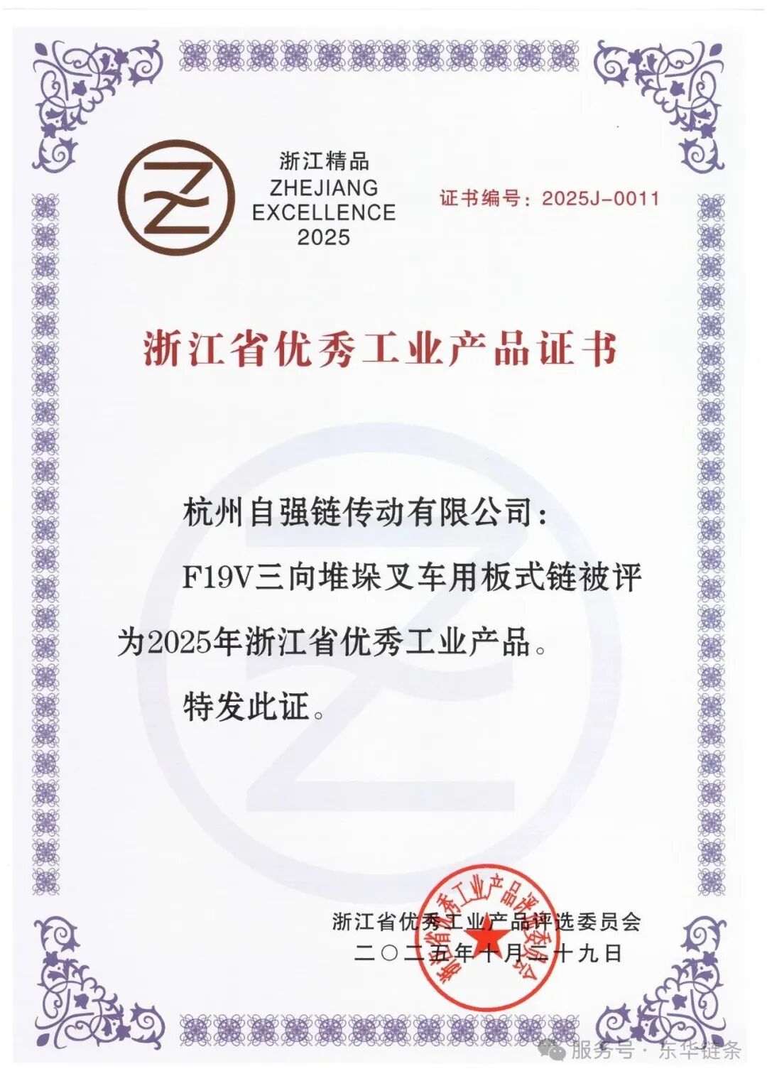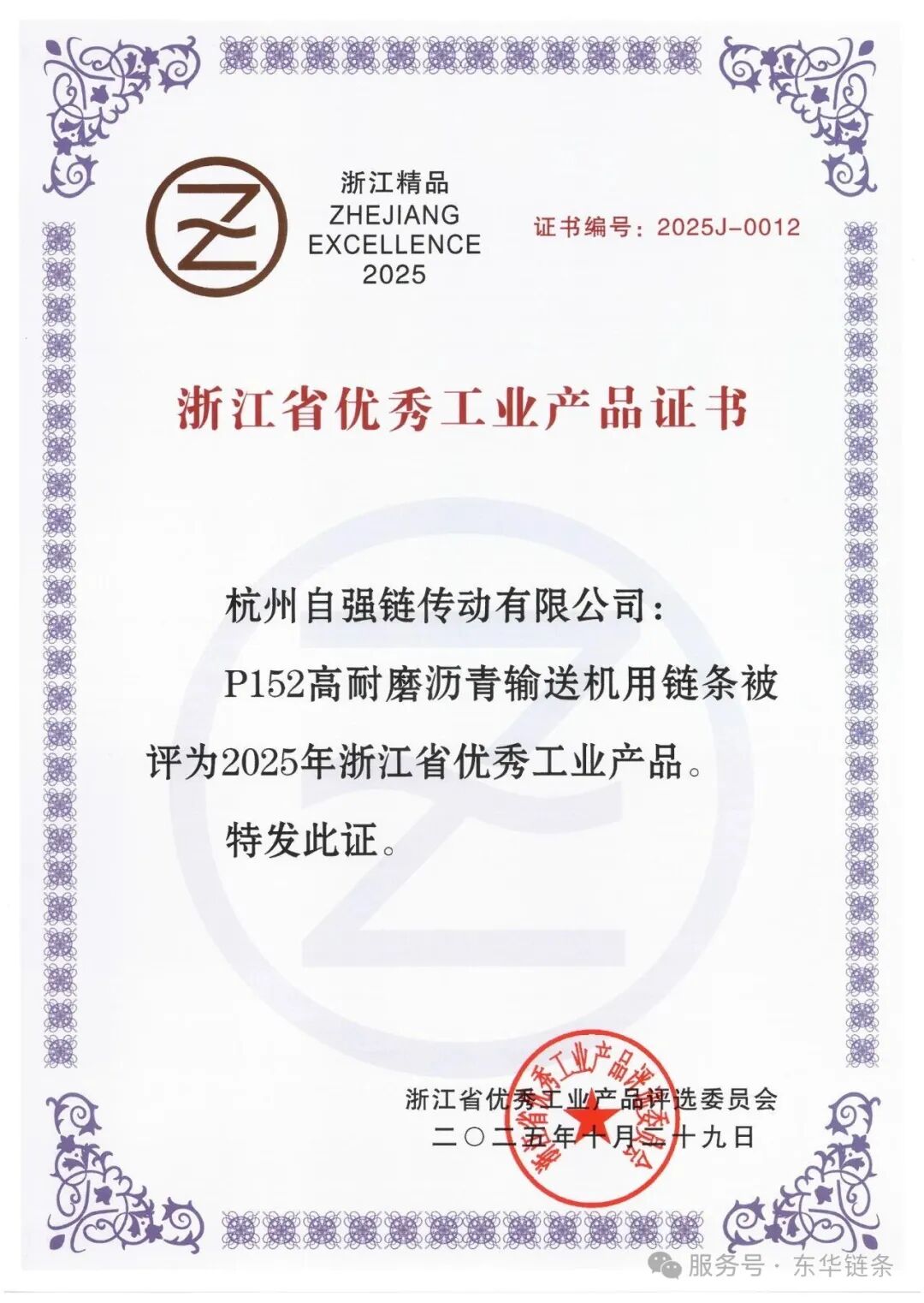 根据《浙江省优秀工业产品评选办法》相关规定,获评产品同时被授权使用“浙江省优秀工业产品标志”(即“浙江精品”标志)。这是东华链条集团高端产品再次荣获“浙江精品”标志认可。