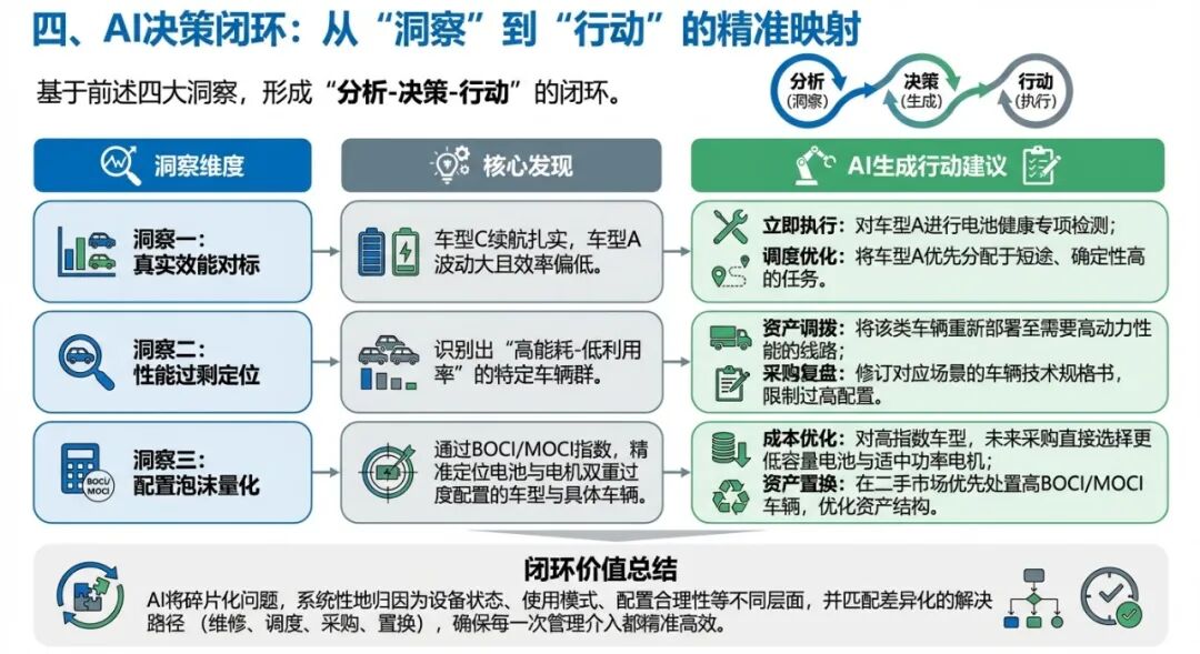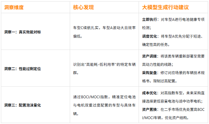 2. 从“事后统计”到“事前洞察”传统报告只能告诉你“上个月哪辆车最耗电”。大模型不仅能诊断原因,更能量化评估配置合理性(如BOCI指数85%),并主动预警潜在风险,实现从定性到精准定量、从事后到事前的决策前置。