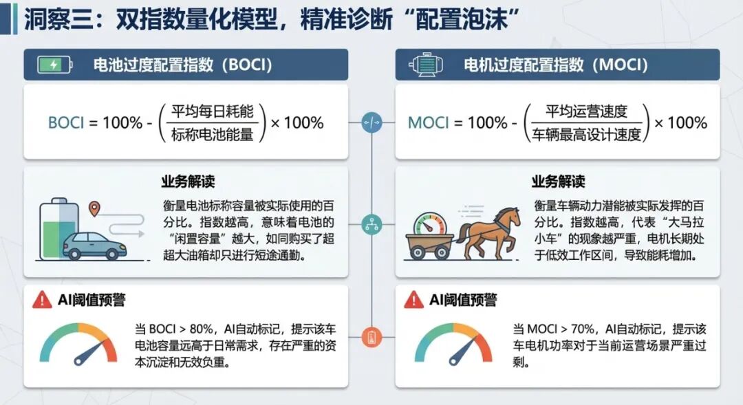 大模型阈值预警:当BOCI > 80%,AI自动标记,提示该车电池容量远高于日常需求,存在严重的资本沉淀和无效负重。