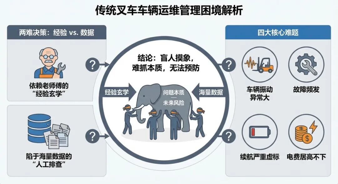 在传统的车辆运维管理中,面对“车辆振动异常大”、“故障频发”、“续航严重虚标”、“电费居高不下”等复合难题,决策往往陷入两难:是依赖老师傅的“经验玄学”,还是陷于海量数据的“人工排查”?这两种方式都如同“盲人摸象”,既抓不住问题本质,又无法预防未来风险。