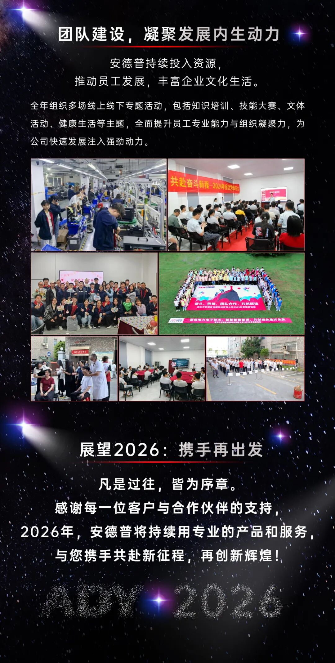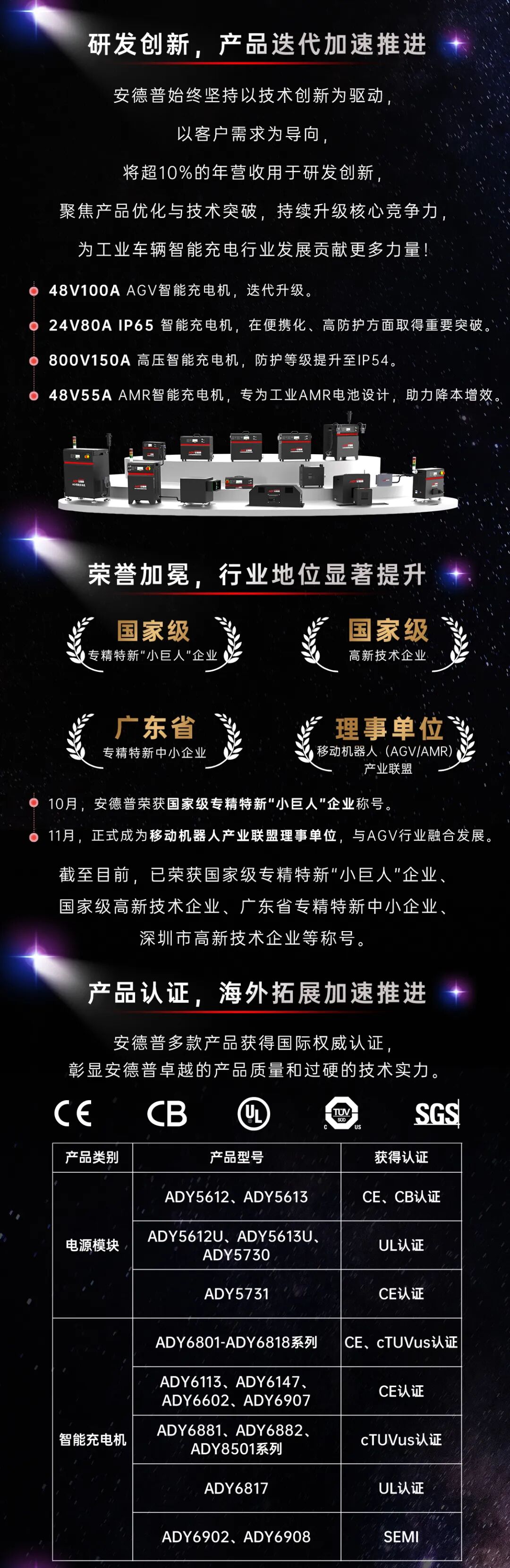 ADY POWER 安德普专注于工业电池智能充电解决方案,是国家级高新技术企业、深圳市高新技术企业、深圳市双软企业、深圳市中小微创新型企业,创始于 2017 年深圳,企业员工 300 余人,研发创新团队 90 余人。
