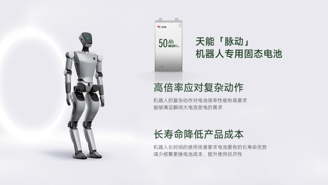 天能通过自主构建的固态电液高倍率与快充技术体系,从材料、电极到电芯实现全链路协同设计,使电池在持续高功率输出(可满足12C持续放电>99%初始容量)、快速补能(6C充电至80%仅需8分钟)及长效循环(5C充电10C放电,循环寿命超过4500圈)方面表现优异,可充分满足服务机器人在动态任务执行、高频作业等场景下的高负载能源需求。