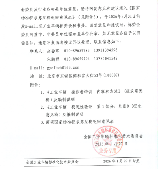 关于对国家标准《工业车辆 稳定性验证 第1部分:总则》和《工业车辆 操作者培训内容和方法》(征求意见稿)征求意见的通知