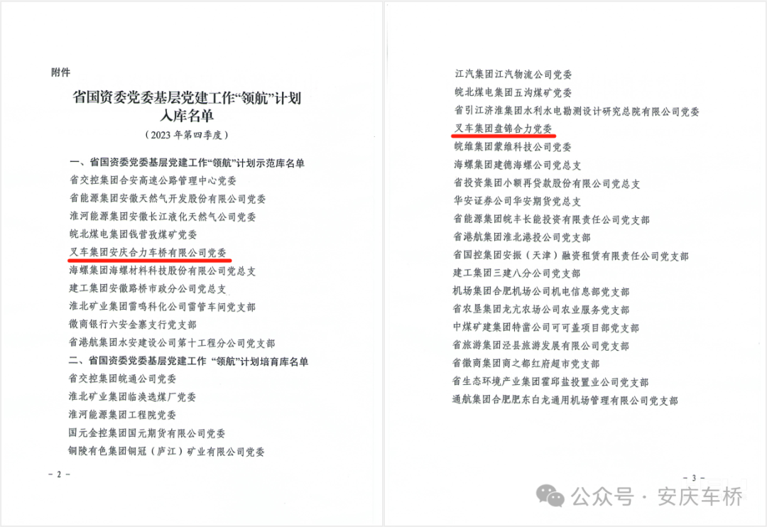 2023年,安庆车桥党委入选省国资委党委“领航”计划示范库