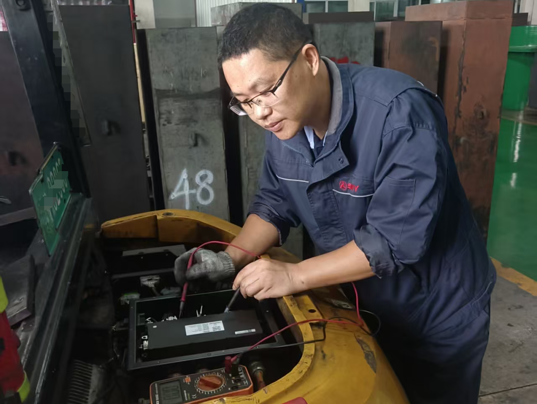 抵达现场后,唐令赟凭借丰富的经验和专业检测设备,迅速精准定位故障根源为DCDC继电器损坏。为彻底排查诱因,唐令赟与司机深入沟通,并追溯到是因司机误设老款通用充电桩所致。明确原因后,他立即更换全新部件并同步对启动蓄电池进行充电补给,仅用2小时便使叉车恢复正常运行,快速化解了客户的物流梗阻危机,体现了过硬的技术实力与高效的现场排障能力。