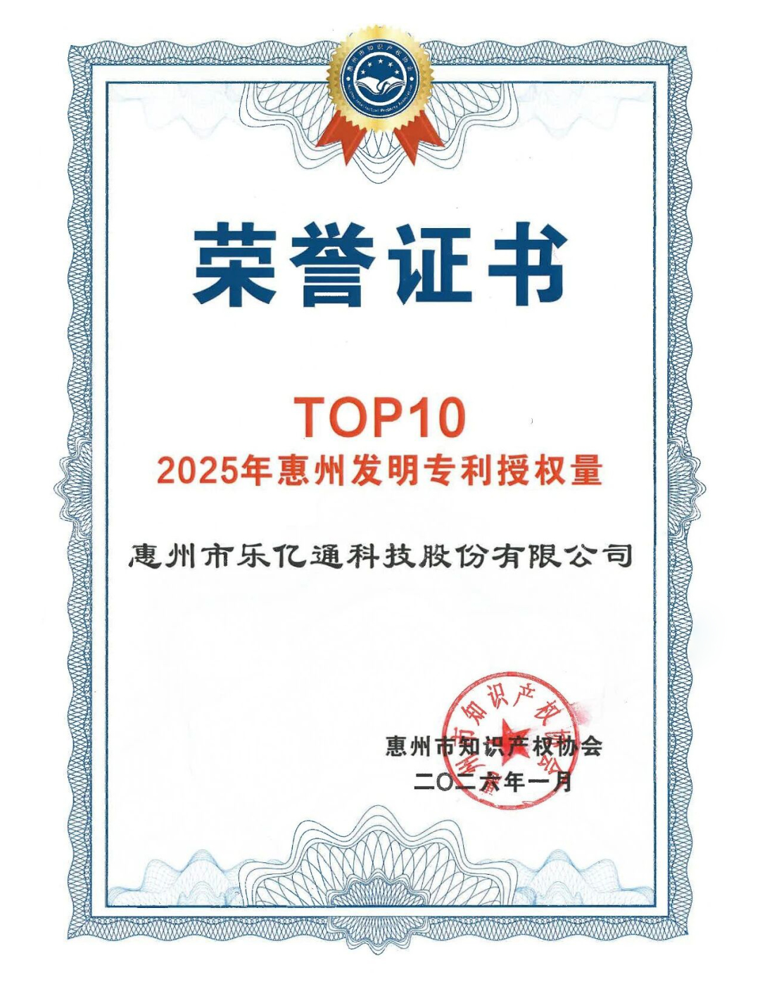 在近日召开的惠州市知识产权协会年会上,乐亿通科技入选2025年度“惠州发明专利授权量TOP10”榜单。