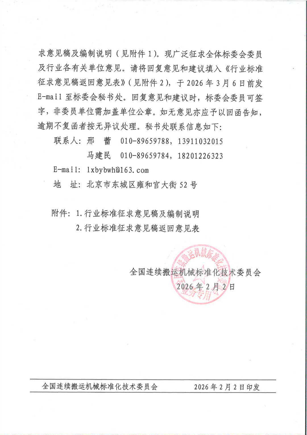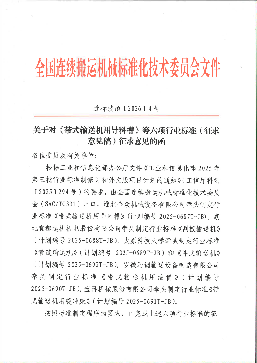 关于对《带式输送机用导料槽》等六项行业标准(征求意见稿)征求意见的函