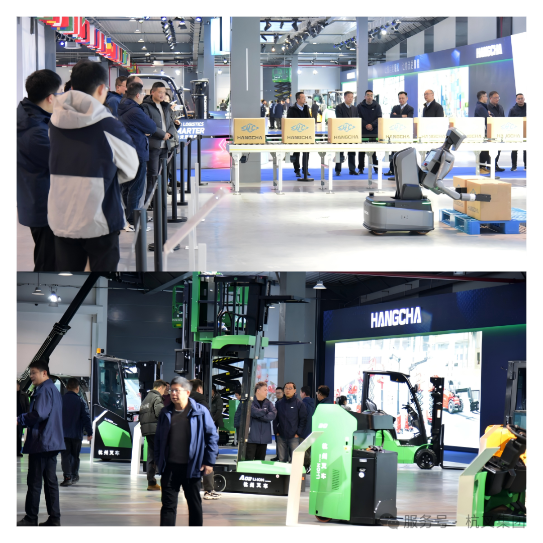 与会人员分批参观了横畈科技园四期和新体验中心、石桥科创园和新展厅。石桥科创园A座2楼的新展厅成为了本次参观的另一大亮点。这里不仅展示了杭叉集团的全系列产品,还特别设置了智能物流解决方案展区。展厅中央最引人注目的是公司最新发布的X1系列物流人形机器人。