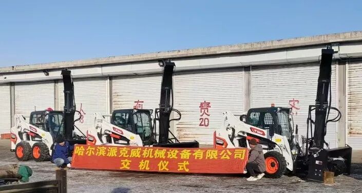 哈尔滨三台山猫S550披挂吹雪机出征。-30℃的极寒是东北市政的试金石,S550以50.7kW澎湃动力驱动液压吹雪机,螺旋刀高速旋转,积雪与薄冰被卷起抛至12m外。
