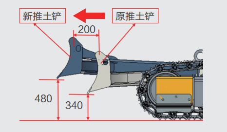 推土铲加长并抬起,高度增加至465mm,角度加大至27.4°,消除行走阻碍。