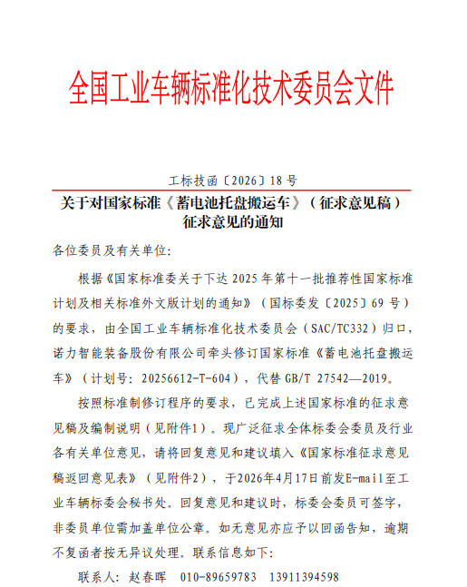 关于对国家标准《蓄电池托盘搬运车》(征求意见稿)征求意见的通知