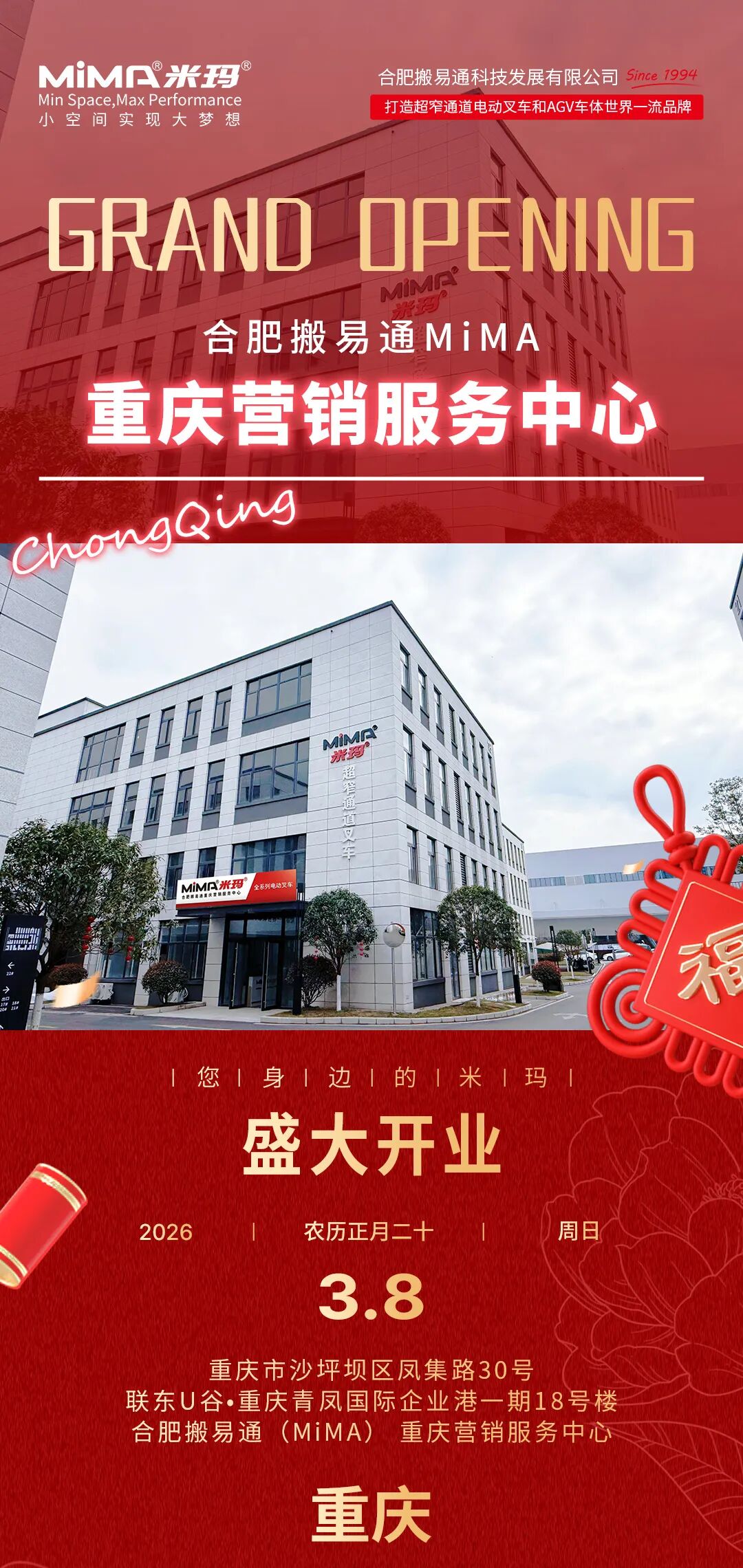 为更高效地响应市场,更深度地服务客户。合肥搬易通(MiMA米玛)荣幸宣布,MiMA电动叉车重庆营销服务中心开业仪式将于2026年3月8日上午9点(农历正月二十),在重庆市沙坪坝区凤集路30号联东U谷·重庆青凤国际企业港一期18号楼一层盛大举行,诚邀您拨冗莅临,共襄盛举。