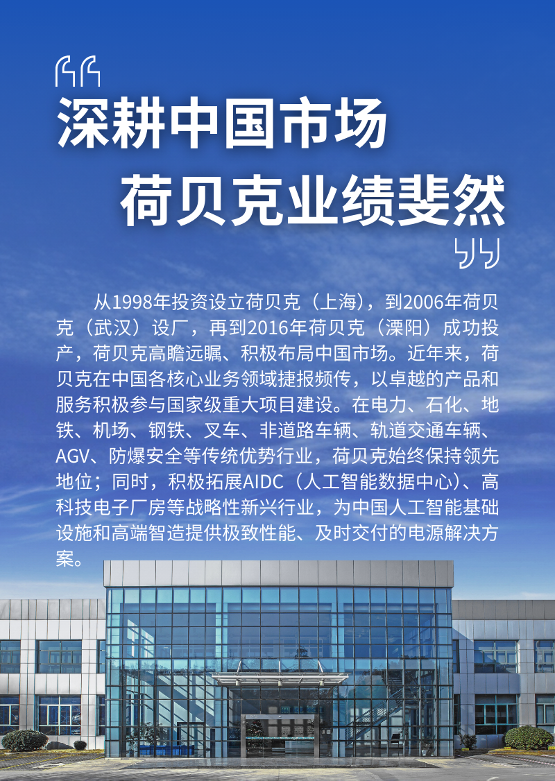 荷贝克品牌以优质的质量和服务著称,客户可以轻松获得广泛分布的来自全球21个子公司和销售办事处及服务站的服务。不论是谁,不管您在何处,荷贝克都将为您提供电能保障!